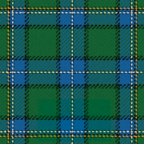 This tartan features a vibrant mix of rich green and deep blue, accented with yellow, white, and black lines: